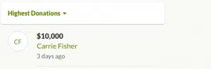 Carrie donated the money under her married name, Carrie Fisher.